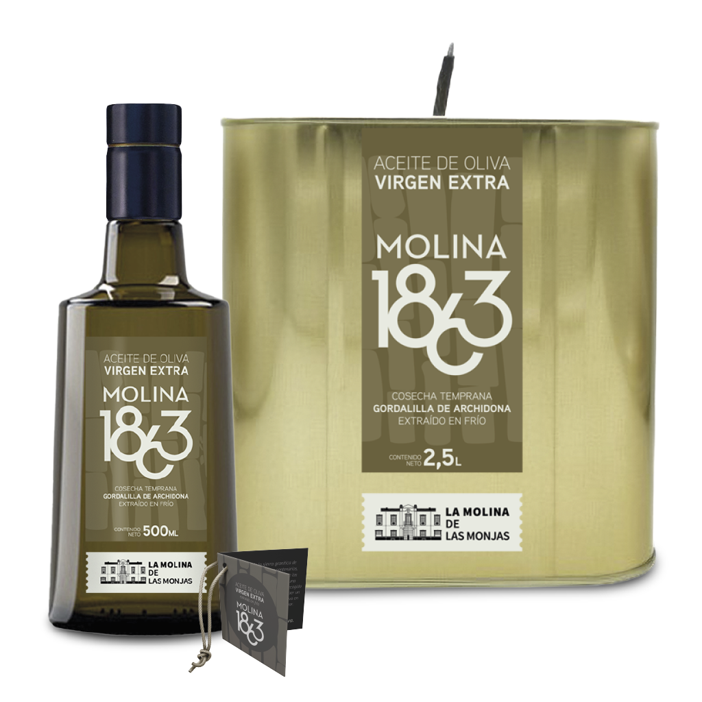 Molina 1863 es un AOVE de finca, elaborado en microproducciones y molturado en pocas horas para preservar frescura y sabor. Su perfil aromático lo convierte en un aceite versátil y elegante, perfecto tanto para cocina diaria de calidad como para uso gastronómico. Está disponible en botella de 500 ml, ideal para mesa y degustación, y en lata de 2,5 litros, pensada para hogares que valoran un buen aceite o para cocinas profesionales que buscan regularidad y carácter.